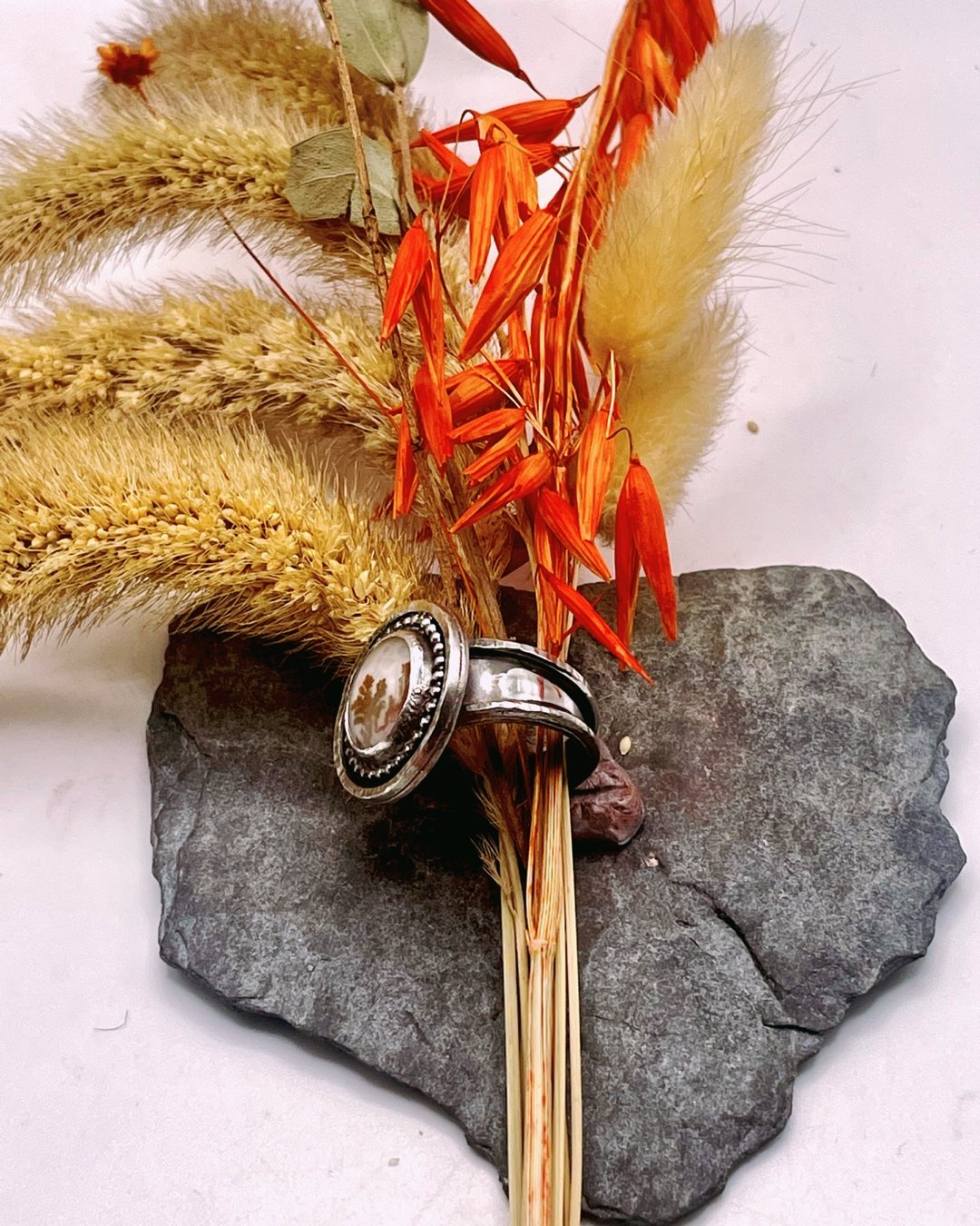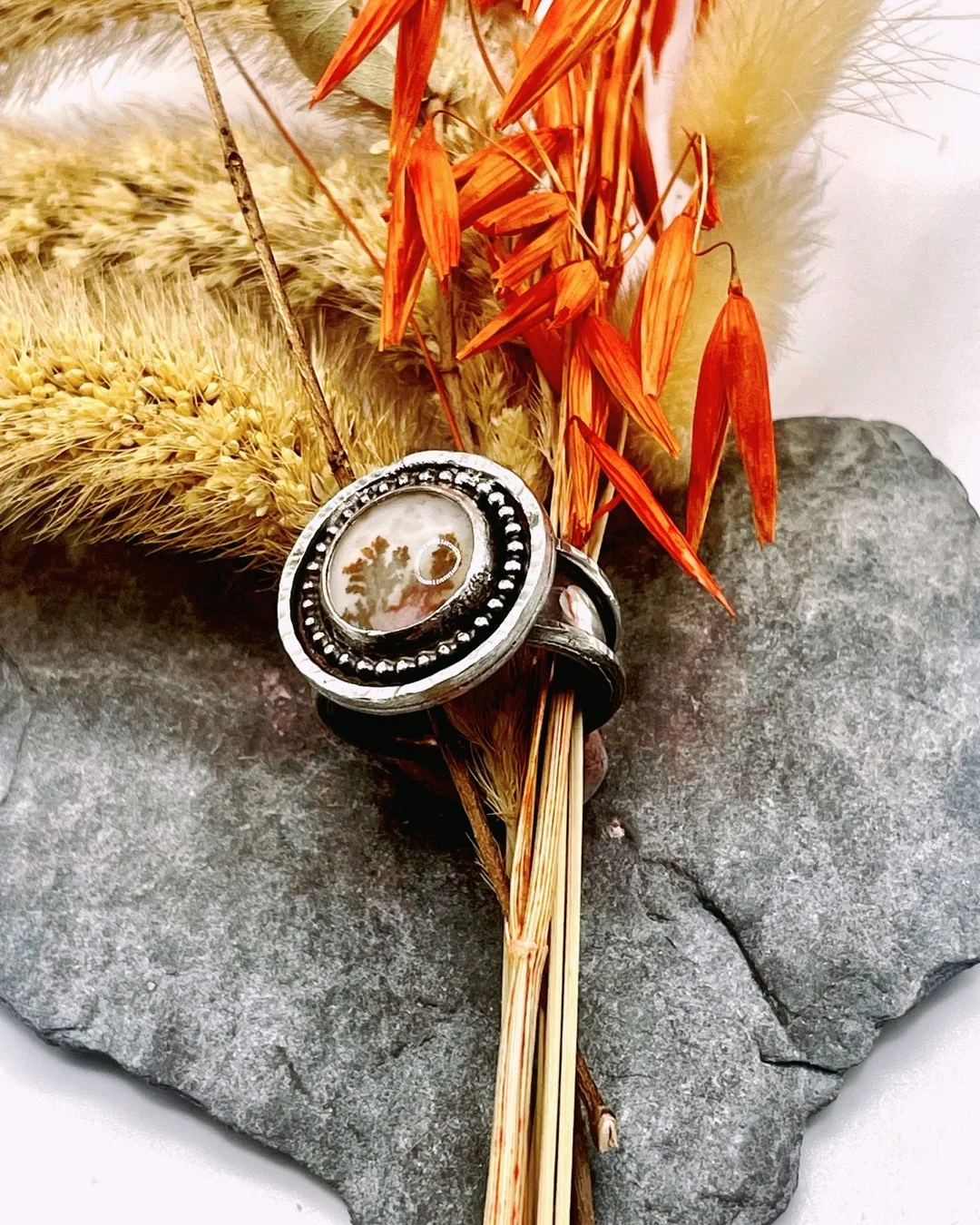 Handmade in Sterling silver, the Cornucopia pendant features a large, glowing Amber stone and a little moon, hung on a 20” chain. Large and commanding, this piece is one of a kind.